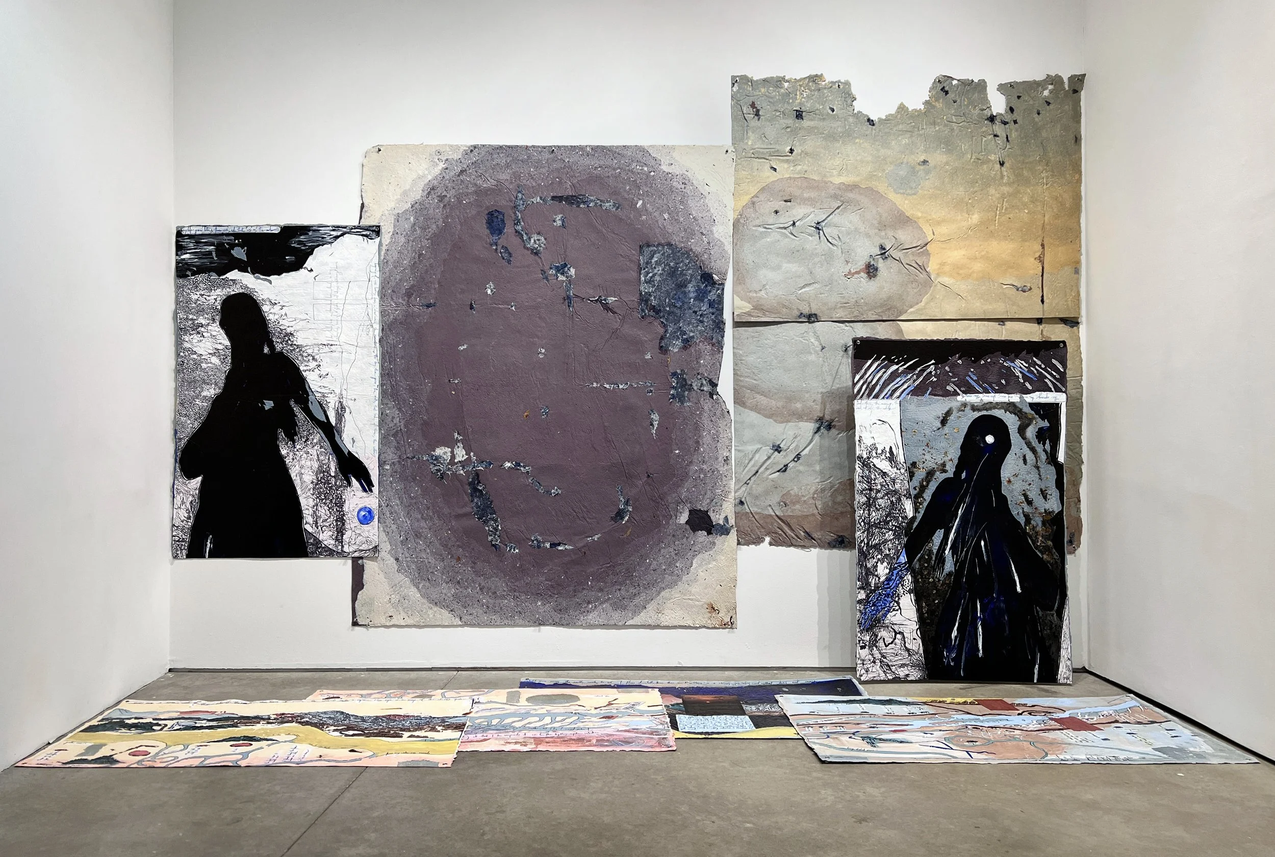 In Inland, Hong Hong examines the body as a closed ecological system, where various materials continually interact to sustain and regenerate itself. The large-scale paintings are made from hand-formed paper imbued with fragments from the natural world and Hong’s personal history - invasive plants or soil collected from Leelanau Clay Cliffs, objects preserved by her late grandfather, water from the Atlantic, images of the moon, poems written by Hong and then translated by her mother. This exhibition considers subjectivity as a remote region, sovereign and far from all borders.